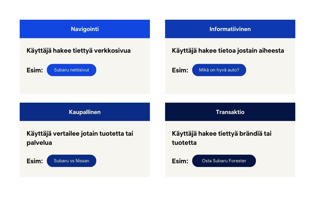 - Sisällön tyyppi: Varmista, että sivusi tarjoaa oikeanlaista sisältöä hakulausekkeelle tarkastelemalla, minkä tyyppiset tulokset sijoittuvat avainsanalle (esim. aloitussivut, tuotesivut, informatiiviset postaukset, arvostelut jne.).