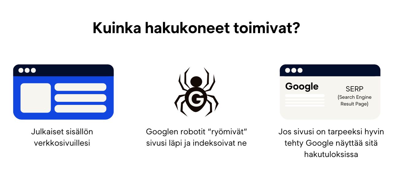 - Serving results: Kun käyttäjä tekee haun Google määrittää mitkä sivut ovat parhaita sekä laadun, että relevanssin kannalta ja sijoittaa ne hakutulossivulle (SERP).