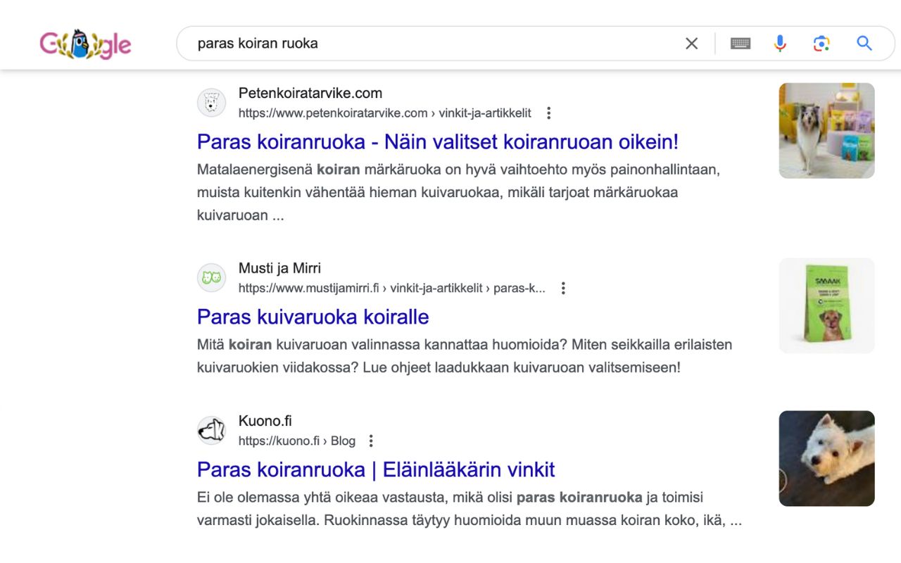 Siksi Google sijoittaa joko tuotesivut tai arvostelut parhaista koiranruokatuotteista korkealle (eli hakutarkoitus on joko transaktio tai kaupallinen).