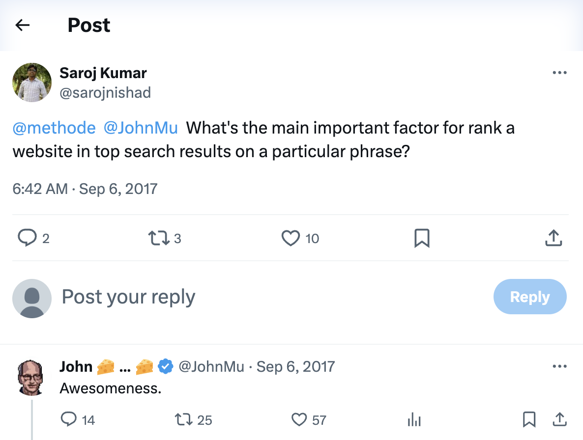 Saroj Kumar kysyi Twitterissä mikä on tärkein tekijä sijoittumisessa hakutulosten kärkeen, johon Googlen edustaja John Mueller vastasi yhdellä sanalla: