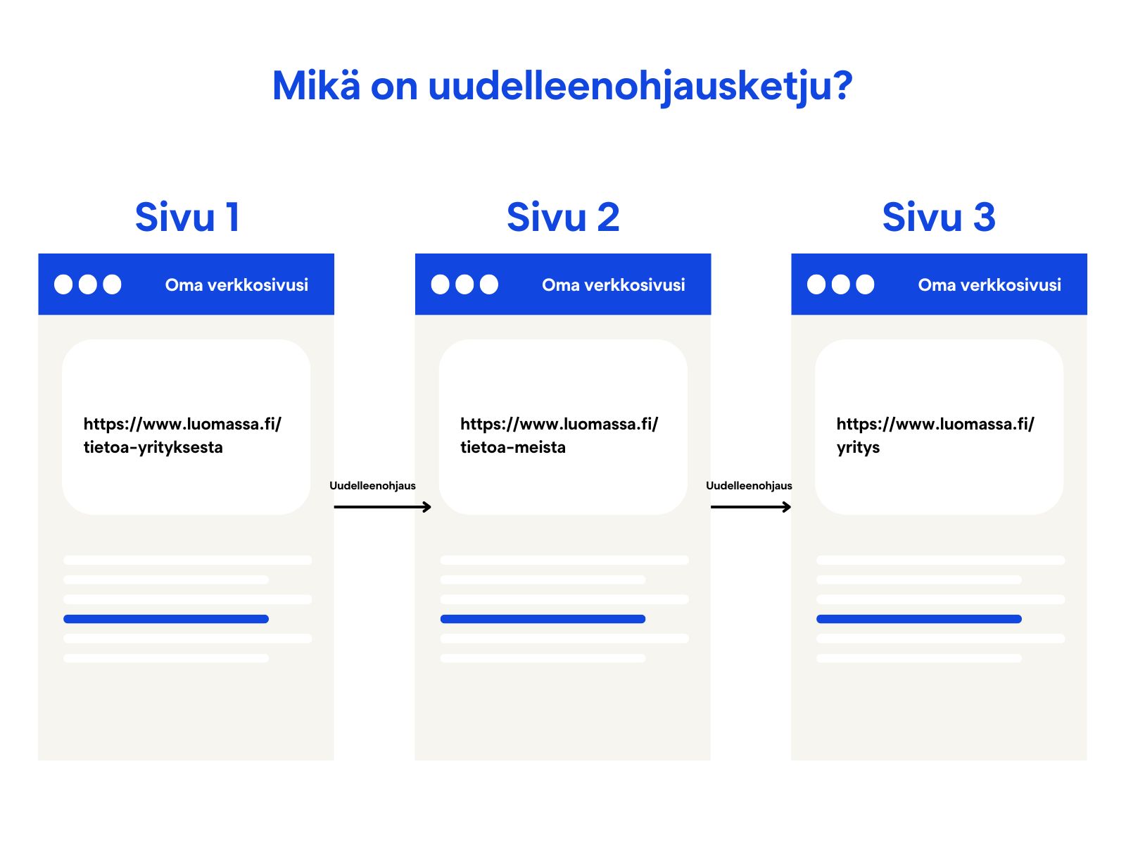 Uudelleenohjausketju tarkoittaa tilannetta, jossa sivu verkkosivustollasi ohjaa toiselle sivulle, joka on jo ohjattu eteenpäin.