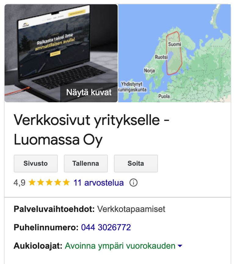 Tältä Google Business Profile voi esimerkiksi näyttää: